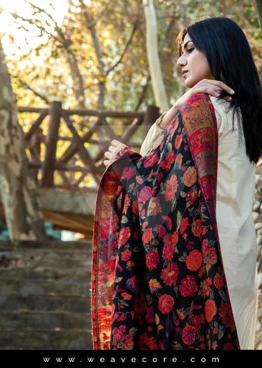 Floral Noir: Black Kani Silk Shawl